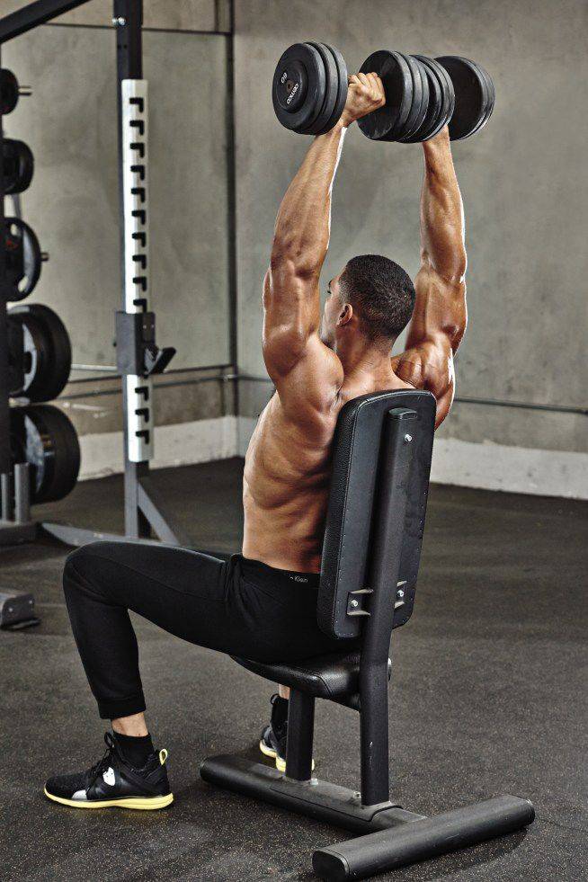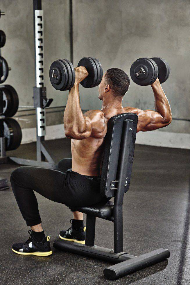 앉아서 어깨높이로 덤벨을 들자. 양 손바닥은 얼굴을 향하게 한다. 덤벨을 머리 위로 들어 올리고, 그와 동시에 팔을 바깥 쪽으로 회전하자. 덤벨을 내릴 때는 동작을 반대로 하면 된다.