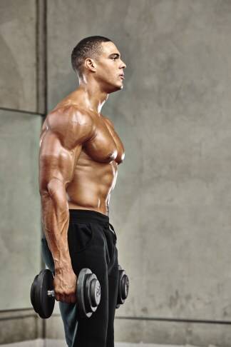 손바닥이 안쪽을 향하게 해서 양손 각각 덤벨을 쥐고 바로 서자. 팔을 들어 올리면서 손바닥이 위를 향하게 하고, 새끼손가락은 어깨를 향하게 하자. 정점에 도달하면 1초 동안 수축을 유지하고, 그런 다음 다시 중량을 낮추자.