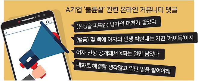 최근 온라인을 중심으로 확산한 A기업 직원 간의 ‘불륜’ 글에 달린 한 댓글이다. 해당 글에는 기혼 남성과 결혼을 앞둔 여성이 바람을 피웠다는 설명과 함께 두 사람의 적나라한 대화 내용, 여성의 사진과 이름 등 신상정보까지 담겼다. 글 밑에는 ‘신상정보를 폭로한 남성의 행동이 옳다’는 취지의 댓글이 줄을 이었다. 불륜 상황에 대처하는 ‘정석’이라고 치켜세우거나, 향후 명예훼손 등의 혐의로 벌금을 물더라도 여성에게 더 큰 피해를 안겼으니 ‘합리적’이라는 글도 많았다. 불륜 당사자로 지목된 이들에 대해서는 외모를 비하하거나 욕설을 퍼붓는 댓글이 이어졌다. 온라인 공간이 이름 모를 이들의 ‘단죄의 장’이 된 것이다.