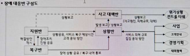 재난 시에는 △재난대책본부 △종합재난상황실 △지역재난상황실을 운영하며 단위 조직별로 업무분장을 네트워크장애 처리 지침과 통신재난관리지침에 명시했다.