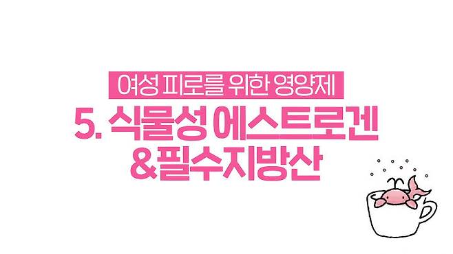 필수지방산은 리그난, 이소플라본같이 여성호르몬의 균형을 맞춰주는 작용을 한다기보다는 여성피로의 원인이 되는 염증물질인 프로스타글란딘의 대사장애를 개선해주어 유방압통, 생리통 등을 낮춰줄 수 있어요.