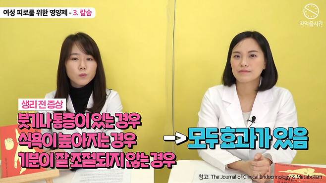 칼슘이 신체적, 심리적 증상을 모두 조절하기 때문에 생리가 다가오기 전에 붓기나 통증이 있는 경우, 식욕이 높아지고, 기분이 잘 조절되지 않는 경우에 모두 효과가 있어요. (참고: The Journal of Clinical Endocrinology & Metabolism)