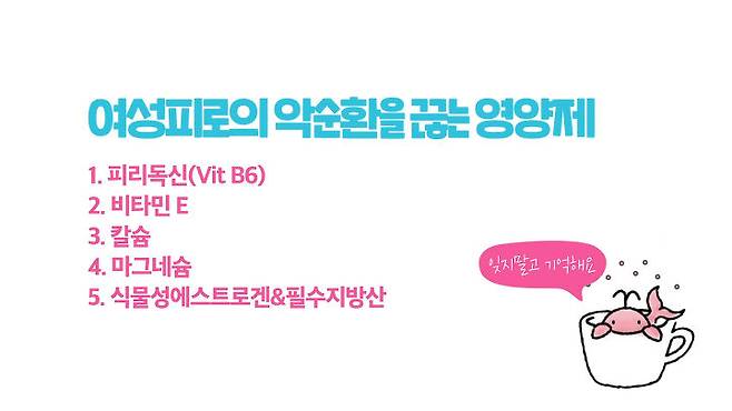 그럼 본격적으로 이 여성 피로의 악순환을 끊는 데 도움이 되는 영양소에는 무엇이 있는지 알아볼게요~