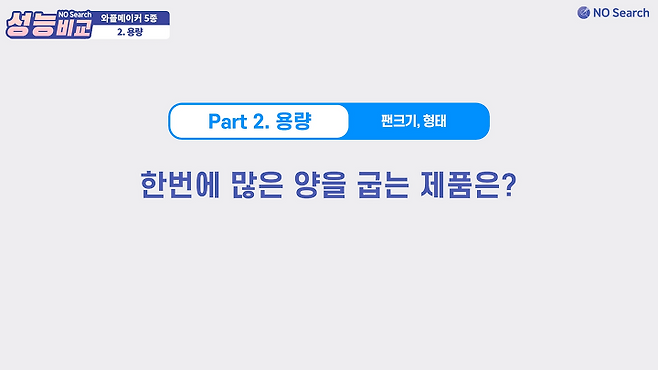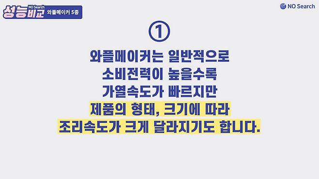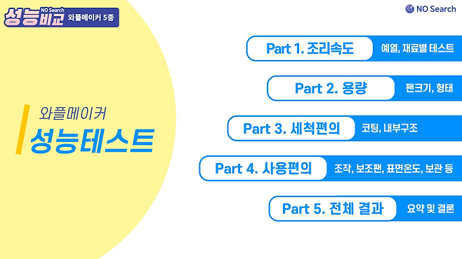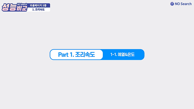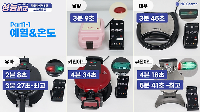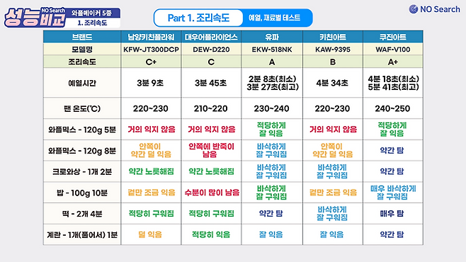예열시간과 재료별 테스트를 고려한 조리속도는 쿠진아트와 유파가 가장 빨랐습니다.