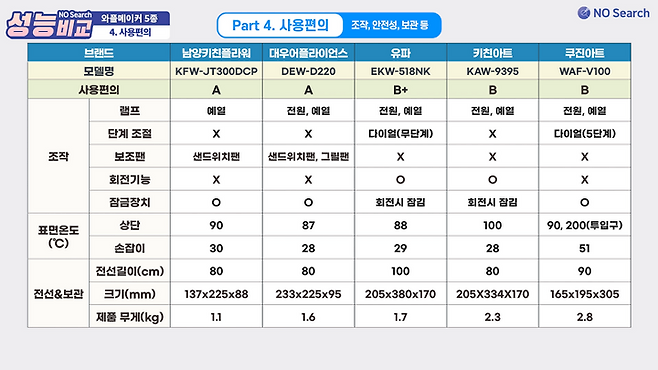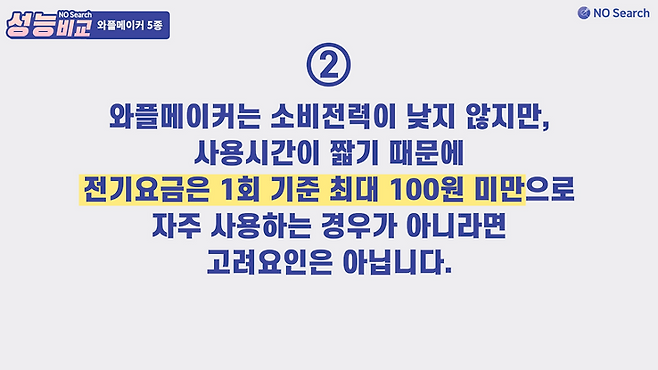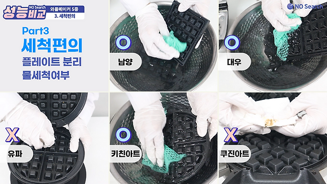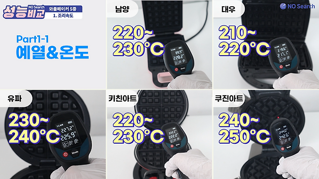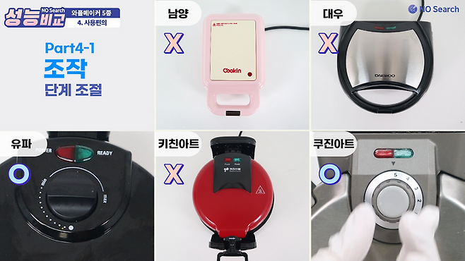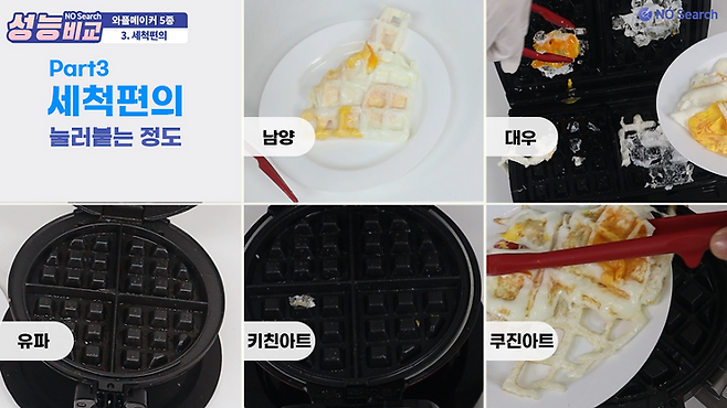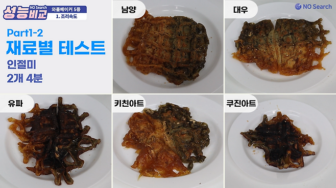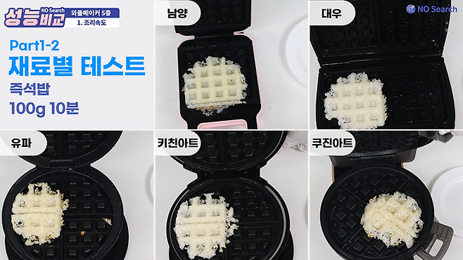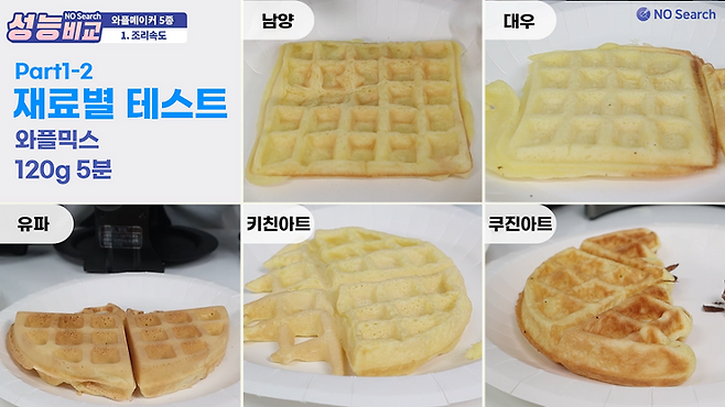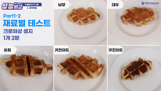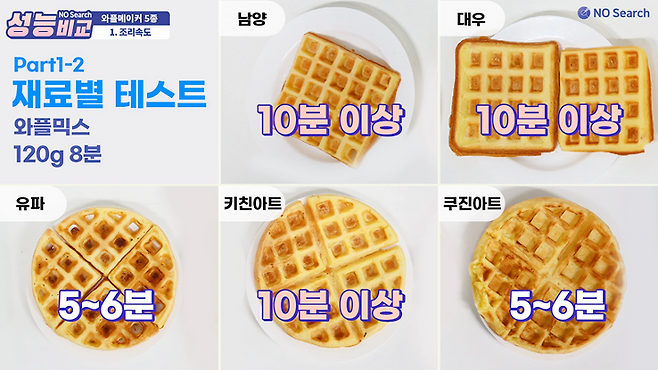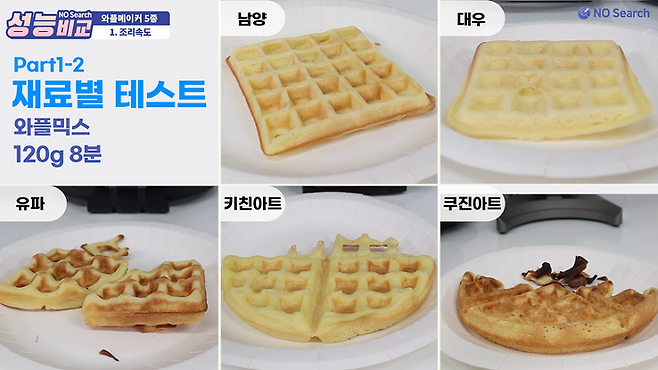 잘 익은 와플을 만드려면 쿠진아트와 유파는 5~6분 정도면 충분했고, 남양, 대우, 키친아트는 10분 이상 필요했습니다.