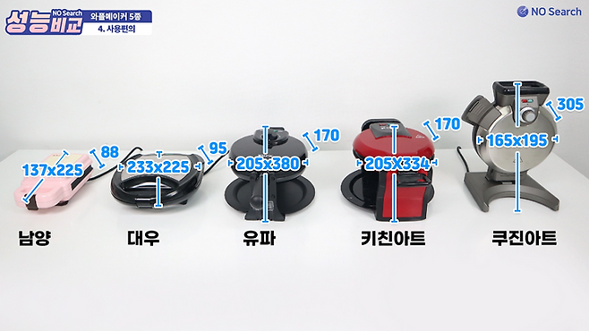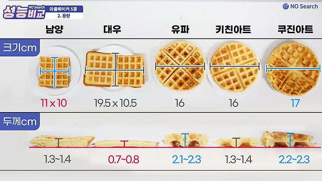 실제로 와플믹스를 가득 채운 상태로 작동시키면, 쿠진아트가 가장 크고 두꺼운 와플이 만들어졌고, 남양이 가장 작은 와플, 대우가 가장 얇은 와플이 만들어졌습니다.