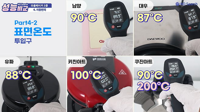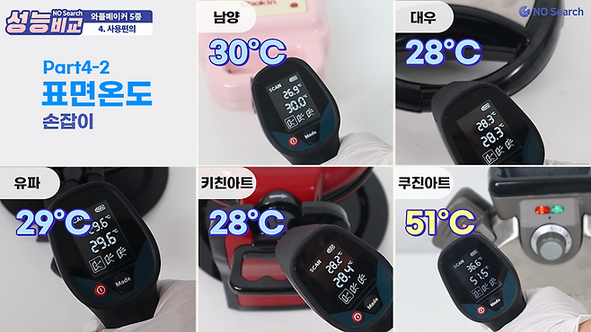 5개 제품 모두 표면이 플라스틱으로 덮여있지만 표면온도가 90~100℃ 정도로 높았고, 쿠진아트의 투입구 쪽은 200℃ 가량으로 매우 뜨거웠습니다.