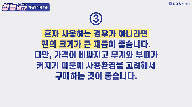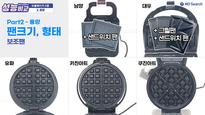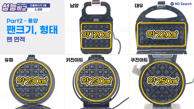 팬의 면적은 쿠진아트가 약 250㎠으로 가장 컸고 남양이 약 120㎠으로 가장 작았습니다.