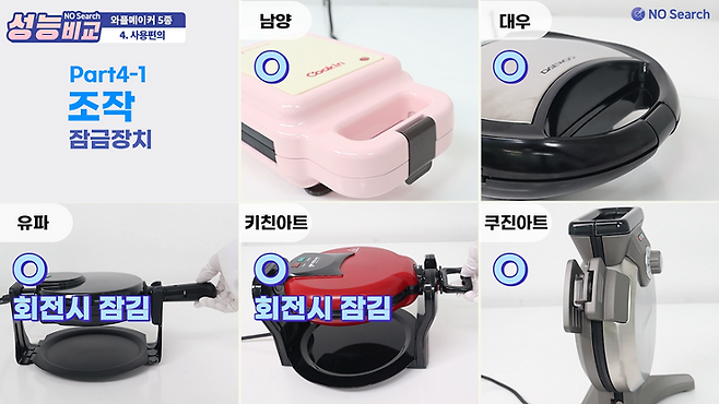 와플이 부풀어 오르면서 팬 뚜껑이 열리기도 하는데, 남양, 대우, 쿠진아트는 손잡이 쪽에 잠금장치가 있었고 유파와 키친아트는 회전 시 자동으로 잠기는 형태였습니다.