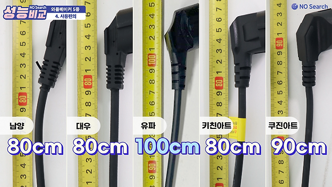 먼저 전선길이는 유파가 100cm 정도로 가장 길었고, 쿠진아트 90cm, 남양, 대우, 키친아트는 80cm 정도였습니다.