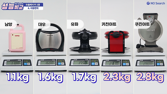 무게는 남양이 약 1.1kg으로 가장 가벼웠고 쿠진아트가 2.8kg 정도로 가장 무거웠습니다.