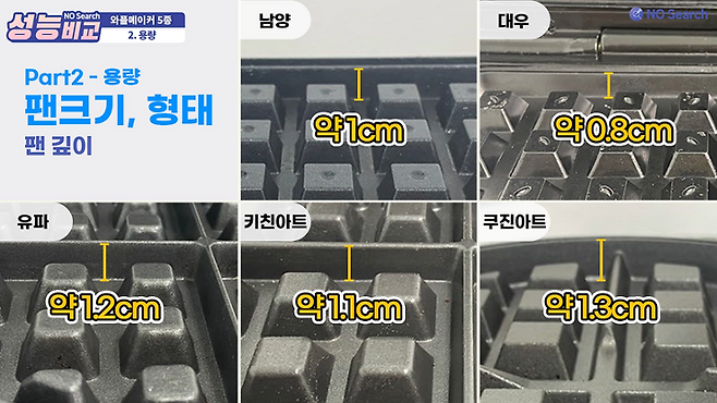 와플의 두께를 결정하는 팬의 깊이는 한쪽 면 기준 쿠진아트가 약 1.3㎝으로 가장 깊었고 대우가 약 0.8㎝으로 가장 얕았습니다.