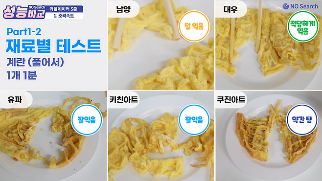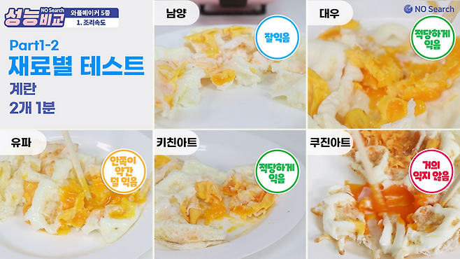 남양이 완숙에 가까운 정도로 가장 잘 익었고, 대우와 키친아트는 반숙정도로 익었습니다. 유파는 반숙, 쿠진아트는 거의 익지 않았습니다.