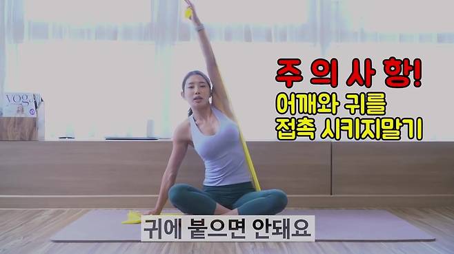 주의 어깨와 귀가 붙으면 안 돼요. 어깨와 귀는 멀~게 하시고 10개씩 3세트 진행해주세요. 머메이드 자세. 인어공주처럼 예쁘게 우아하게 천천히 해보세요. 참~쉽죠?