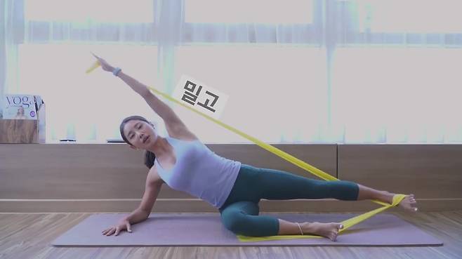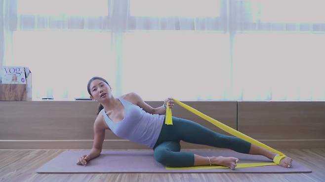 그 상태에서 옆으로 누운 자세를 취해주세요. 그리고 왼손으로 스트랩으로 감은 밴드를 잡고 반대쪽 팔꿈치로 바닥을 짚어줍니다.