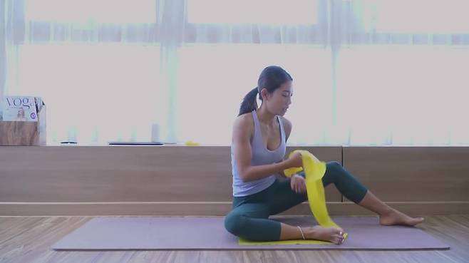 이번엔 옆으로 누운 자세에서 진행할 건데요~ 일단 한 쪽 다리로 밴드를 고정시키고 반대쪽 발에는 밴드를 스트랩으로 감아주세요.