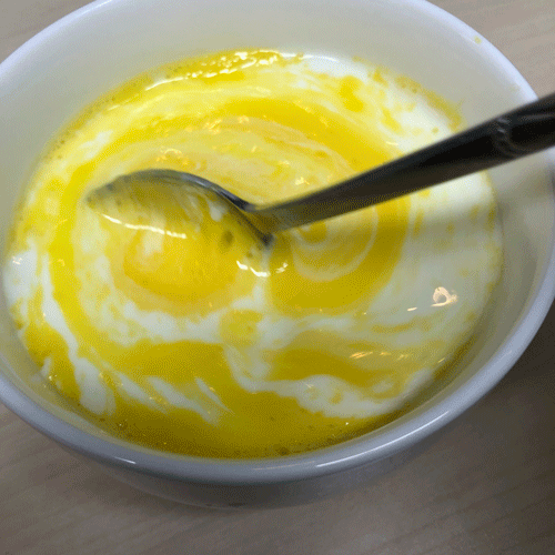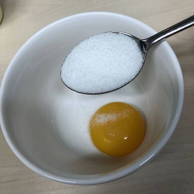 노른자를 그릇에 놓고 설탕 1숟갈을 넣어주면 되는데 달게 먹고 싶은 사람은 설탕 더 넣어도 됨!