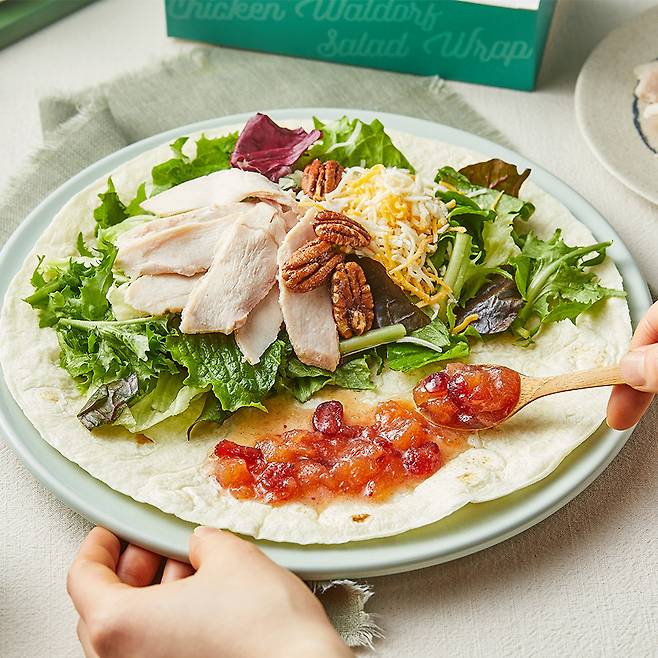 닭가슴살이 들어간 샐러드랩은 어떠세요? 가장 클래식하면서도 사랑받는 샐러드 방식 중 하나인 월도프 샐러드 스타일의 샐러드랩을 시도해보세요. 월도프 샐러드란 사과와 같은 과일과 견과류와 마요네즈 베이스로 부드러운 맛을 최대한 이끌어 낸 방법입니다. 프레시코드는 국내산 닭가슴살 데리야끼 치킨에 새콤달콤한 사과를 시나몬과 버터에 졸인 콩포트*, 칼슘과 비타민이 풍부한 피칸을 넣어 닭가슴살 월도프 샐러드랩을 만들었어요.