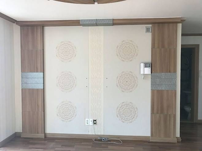 현재 벽걸이 TV를 설치한 곳의 리모델링 전 모습이에요. 혼란스러운 무늬의 벽지와 애매한 아트월은 철거하기로 했어요. 아트월 장식 때문에 이상한 곳으로 옮겨져 있던 스위치도 제 자리로 옮겨왔구요. 이렇게 해두니 영화를 볼 때 영상에만 집중할 수 있어서 좋더라구요:)