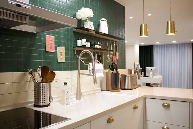 초록색과 골드 포인트가 예쁜 우리집 주방은 집에서 제가 가장 좋아하고 아끼는 공간이에요. 요리하는 것을 좋아하는 사람이라면 아마 모두 저와 같은 마음일거라 생각해요.