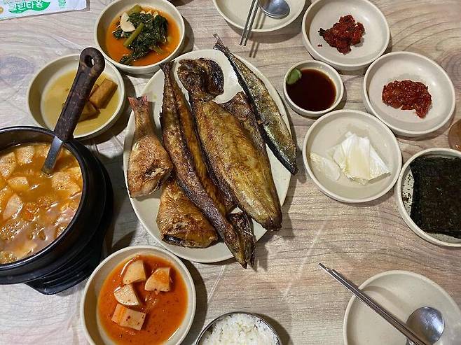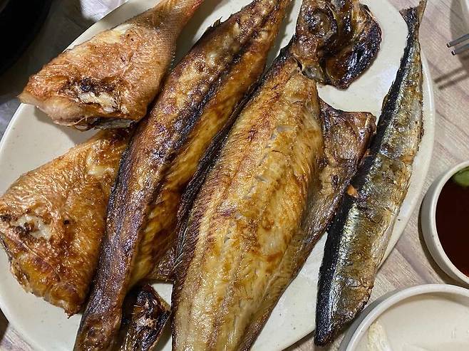 주문진 생선구이집. 생물로 구운 생선 모듬구이 짜지도 않고 살살녹는다. 꽁치 고등어 가자미 열기 4가지 2인분상에 나오는 생선들이다. 하나하나 서울에서 먹던 맛과 다르다. 생선구이의 신세계다