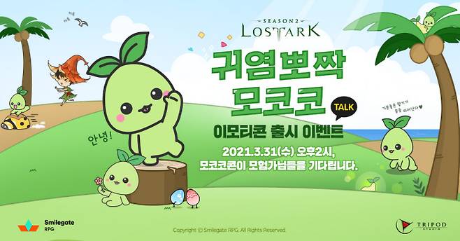스마일게이트 RPG가 ‘로스트아크’ 대표 마스코트 중 하나인‘모코코’를 주인공으로 한 카카오톡 이모티콘 ‘귀염뽀짝 모코코’를 무료로 증정한다고 31일 밝혔다.