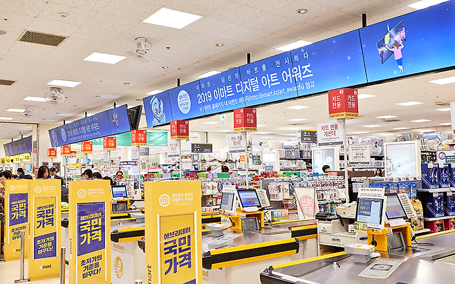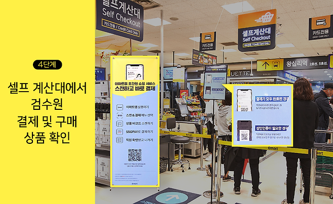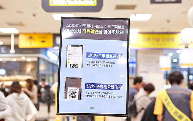 여느 마트와 다름없이 쇼핑한 물건을 계산하려는 사람들로 붐비던 이마트 왕십리점에 새로운 풍경이 등장했습니다. 바로 스마트폰 무인 결제 시스템인 '스캔하고 바로결제' 서비스를 이용하는 사람들의 모습입니다.