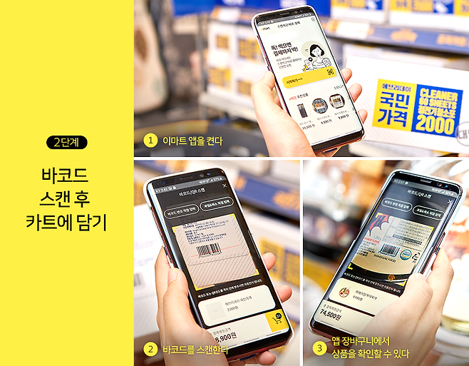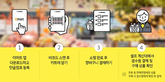 이마트 앱만 있으면 매장 내 어디서든지 앱 장바구니에 상품을 담고, 결제까지 할 수 있는 서비스이다. 서비스 이용 과정을 살펴보자!