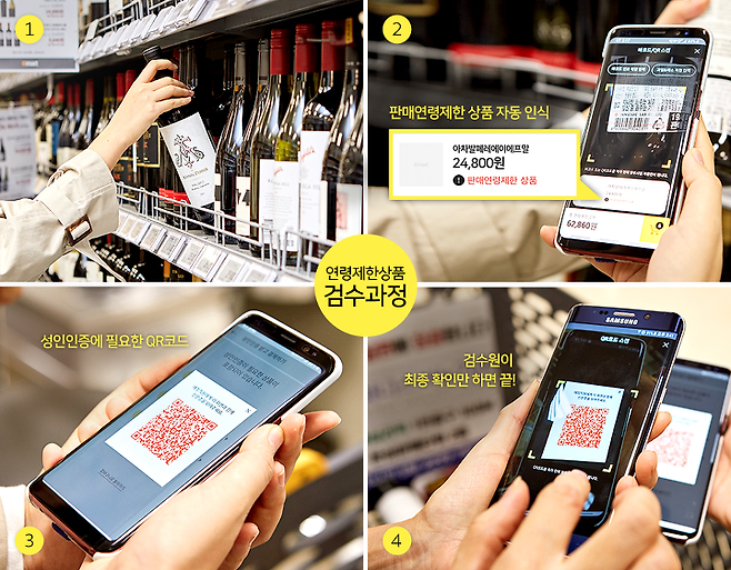 주류 등 판매 연령 제한 상품 구매 시, 바코드를 스캔하면 판매연령제한이라고 표시가 뜹니다. 주류 상품을 구입하는 경우, 바로결제가 불가능하고 검수원에게 성인인증(신분증 확인)을 거친 후, 결제가 가능합니다.