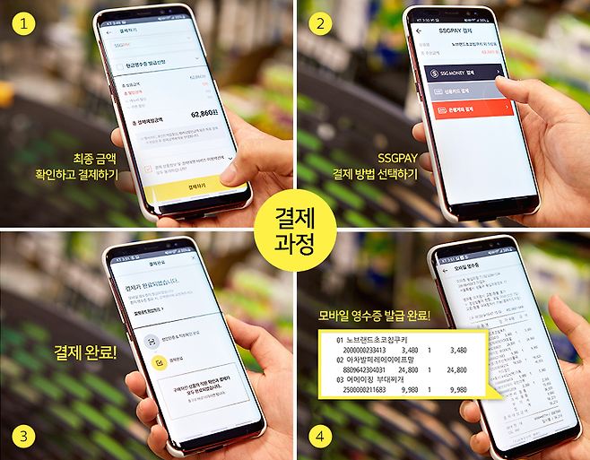 쇼핑이 끝나면 SSGPAY에 등록한 카드로 결제가 됩니다.(*SSGPAY 설치는 필수!) 결제 완료 화면이 뜨면 결제 내역을 확인할 수 있으며, 영수증 발급까지 모든 절차가 모바일로 가능해 종이 영수증 낭비도 줄이게 됩니다.