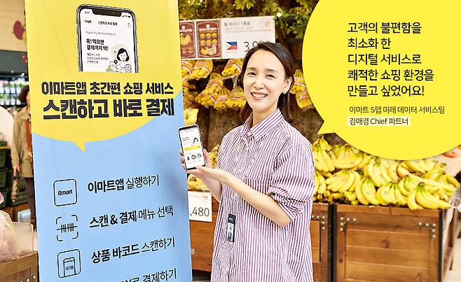 이마트 왕십리점은 이번에 ‘스캔하고 바로결제’ 서비스를 도입해 디지털 트랜스포메이션 1번점으로 거듭나고 있습니다. 이마트의 디지털 혁신기술 연구 조직 S랩(S-LAB)에 따르면, "상품을 찜하거나 장바구니에 담고 삭제하는 등 모바일 쇼핑의 장점을 오프라인에서도 그대로 구현하고자 했다"며, "매장 내점 고객의 쇼핑 편의성을 극대화하는 것이 서비스 도입 배경"이라고 밝혔습니다.