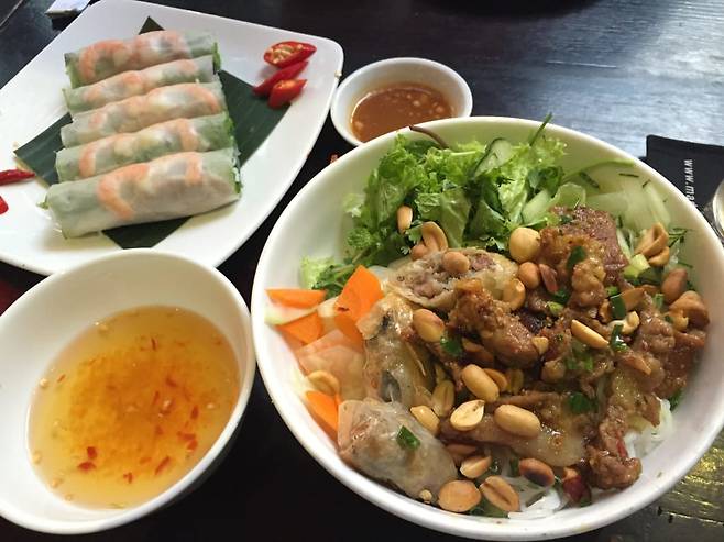 숯불구이와 국수를 곁들여 먹는 음식. 진한 숯불향이 느껴지는 BBQ와 시원한 소면, 토핑으로 뿌려진 땅콜 가루가 묘하게 어울린다. 새콤달콤한 육수에 소면을 적셔 숯불구이와 함께 먹으면 색다른 맛을 즐길 수 있다. 튀긴 스프링 롤인 짜조가 함께 나오는데 피쉬소스인 느억맘에 찍어 먹으면 된다.