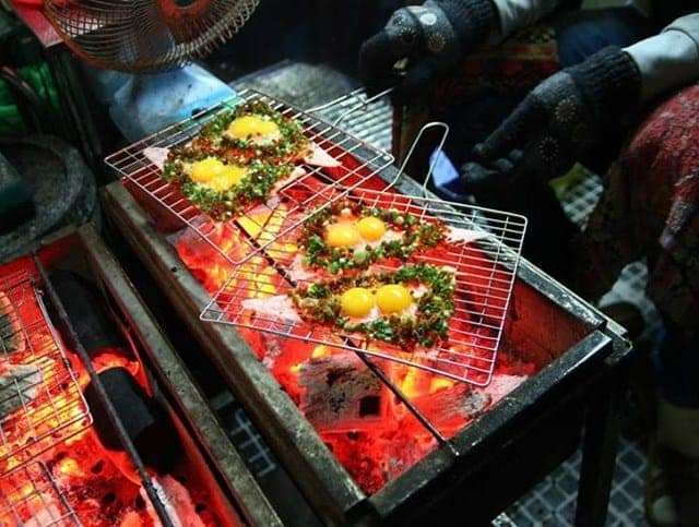 라이스페이퍼 위에 메추리알과 말린 소고기, 파와 고추 등을 얹어 구운 다낭의 명물 간식. 메추리알을 올려 숯불로 노릇노릇하게 구워내어 바삭한 식감이 일품. 라이스페이퍼와 토핑이 어우러져 간식으로 가볍게 먹기 좋다.