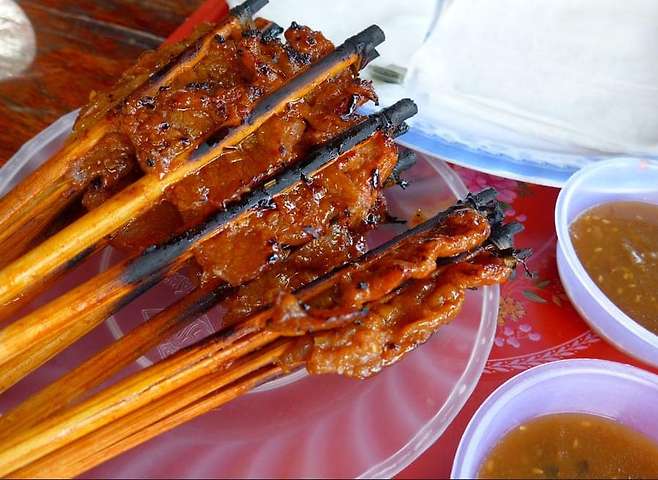 노점에서 흔히 볼 수 있는 꼬치. 양념한 돼지고기를 숯불에 구워 진한 향이 일품이다.