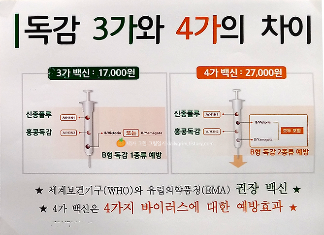 제가 알기론 독감 바이러스는 매년 같은 바이러스가 유행하진 않기 때문에 보통 전년에 유행한 독감은 올해 재유행하는 일이 드물다고 들었어요. 하지만 요즘 우리가 아는 지식이 깨지는 일이 허다하니 4가로 선택했습니다. 4가로 해도 동네병원에서 3가 2명 맞는 것보다 저렴하니까요.