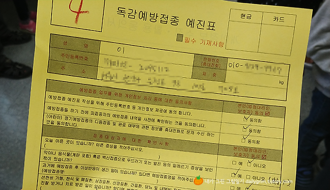 접수대는 사실 전쟁통을 방불케 합니다. 앉을 곳도 없이 서서 접수하고 진찰을 받습니다. 흡사 학교 다닐 때 체육관에서 불주사 맞느라 줄 서던 기억이… 예진표에 간략히 문진 작성을 합니다만, 의사쌤 쓱 곁눈질로 읽고 마시더군요^^;;