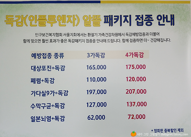 하지만 그러기엔 가격이 너무 비싸죠? 작년 아파트 게시판에는 독감예방 할인 안내문이 붙었는데 당시 회사를 다니고 있어서 기회를 놓쳤습니다. 올해도 기대했는데 부녀회가 조용하네요. 그래서 직접 할인되는 곳을 찾아갔습니다. 바로 인구보건복지협회에서 각 지역에 한 군데씩 운영하는 ‘가족보건의원’이에요.