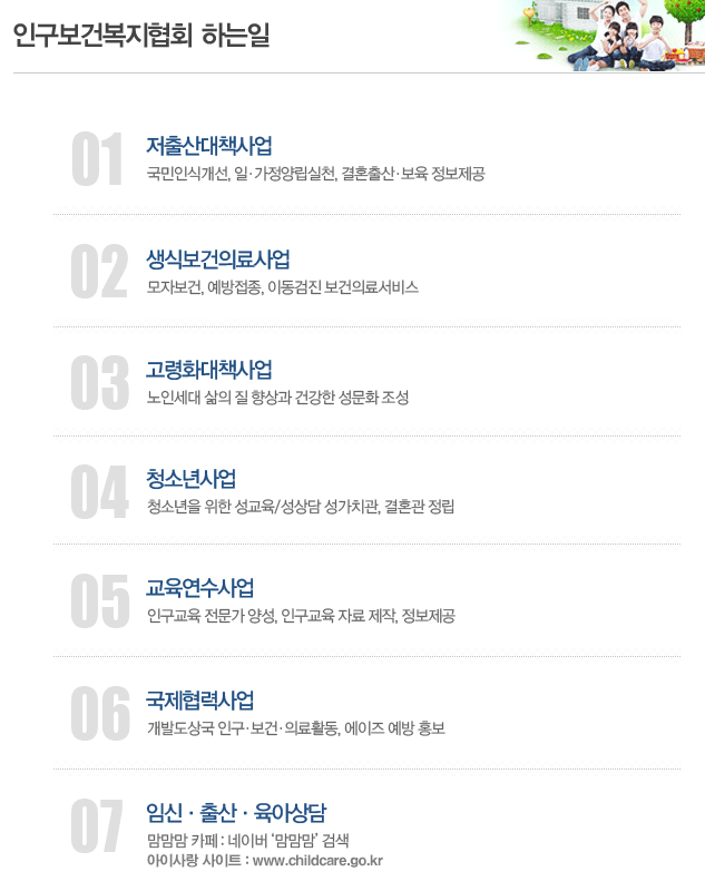 인구보건복지협회는 각 지역에 지회를 두었고, 보통 지회에서 ‘가족보건의원’을 함께 운영합니다. 그곳에서 각종 예방접종과 임신·육아와 관련한 복지 서비스를 하고 있으니 예비 부모나 유아 부모가 알아두면 좋아요.