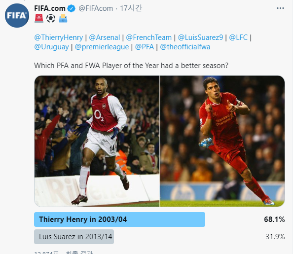 국제축구연맹(FIFA)은 28일(한국 시간) 소셜미디어(SNS)를 통해 팬들을 대상으로 ‘2003/04시즌 앙리와 2013/14시즌 수아레스 중 누가 더 좋은 시즌을 보냈는가?’에 대한 설문을 했다.