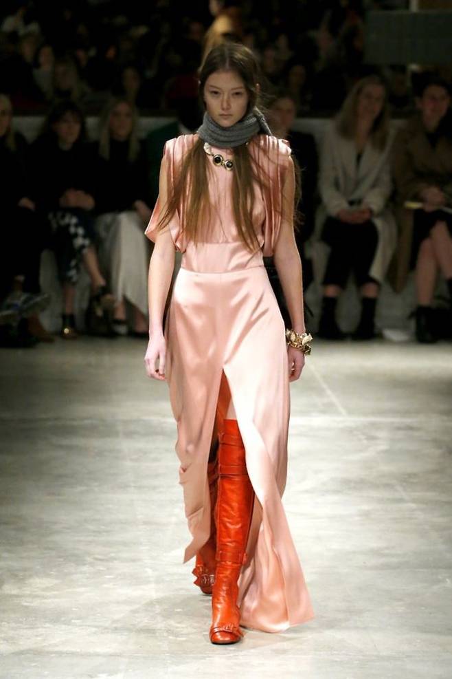 푸카(하와이 해안에 많은 흰 조가비로 끈을 꿰어 목걸이나 팔찌를 만듦) 껍질부터 할머니로부터 영감을 받은 니트에 이르기까지 각각의 디테일들은 의도성이 엿보였다. 그러나 가장 주목을 받은 것은 니-하이 라이딩 부츠와 함께 착용한 부드러운 페탈 핑크 슬립 드레스였다.