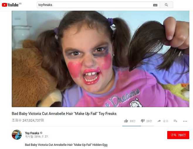 더 솔직히 말하자면 수익에 대한 욕구입니다. 조회수가 곧 돈이 되는 동영상 플랫폼의 수익분배 시스템 때문입니다. 알려진 바에 따르면 유튜브의 경우 조회수 한 건에 보통 1원의 수입이 발생하는데요. 유튜브는 이 수익 중 55%를 동영상 게시자에게 배분합니다. 위에서 말한 두 키즈 채널의 동영상들이 각각 5만에서 230만 조회수를 기록한 것을 생각해보면 이에 따라 발생한 수익도 유추할 수 있죠.