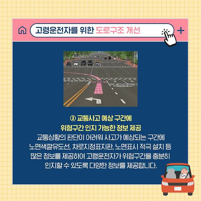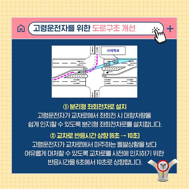 고령운전자가 교차로에서 좌회전 시 대향차량을 쉽게 인지할 수 있도록 분리형 좌회전차로를 설치하고, 교차로를 사전에 인지하기 위한 반응시간을 상향*(6→10초)하여 교차로에서 돌발상황을 보다 여유롭게 대처할 수 있도록 하였습니다.