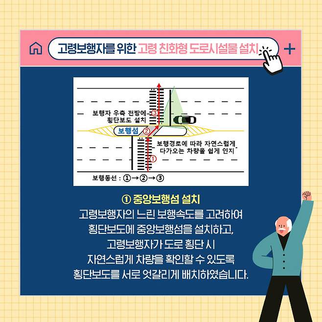 고령보행자의 느린 보행속도를 고려하여 횡단보도에 중앙보행섬을 설치(6차로 이상)하고, 고령보행자가 도로 횡단 시 자연스럽게 차량을 확인할 수 있도록 횡단보도를 서로 엇갈리게 배치하였습니다.