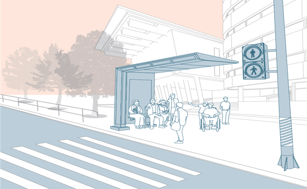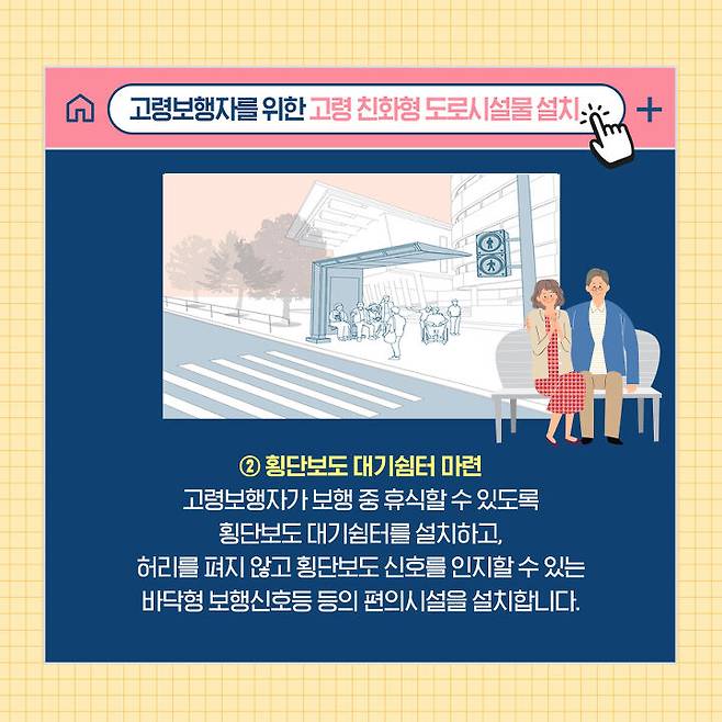아울러, 고령보행자가 보행 중 휴식할 수 있는 횡단보도 대기쉼터, 허리를 펴지 않고 횡단보도 신호를 인지할 수 있는 바닥형 보행신호등 등 편의시설을 설치하여 편리하게 보행할 수 있도록 하였습니다.