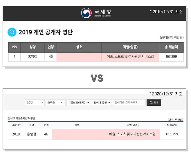 국세청은 이를 포함해 홈페이지 개편도 진행해, 웹의 한 페이지에 나오는 인원 수를 기존 20명에서 최대 100명까지 나오도록 조건을 지정할 수 있게 했습니다. 그런데 그 내용을 상세히 들여다보면, 인적사항 공개가 부정확하다는 비판이 나왔던 기존의 문제점이 완전히 개선되지는 않았습니다.