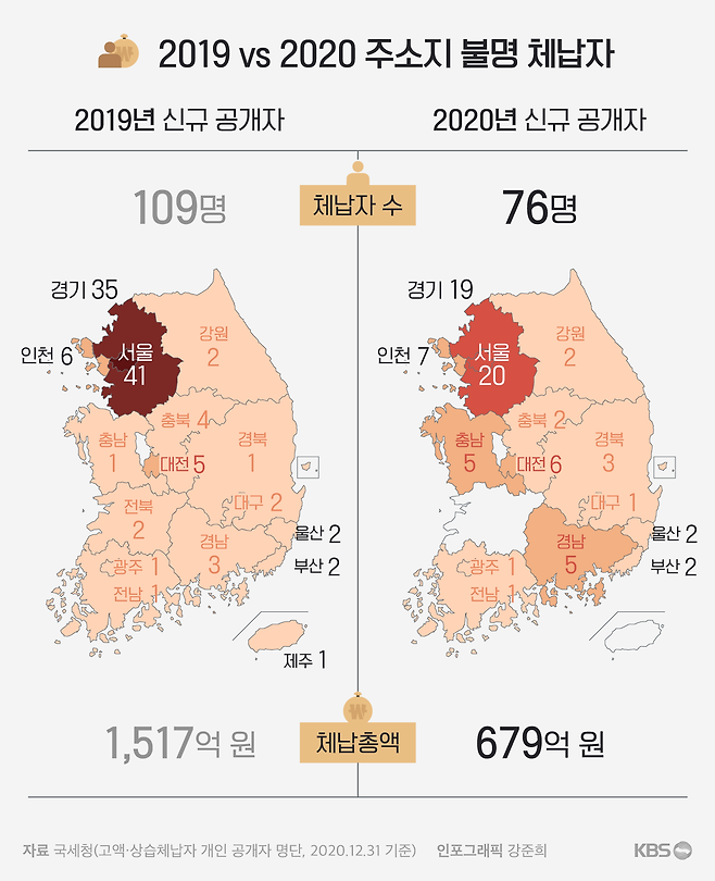2020년 신규 공개자 기준으로 주소지를 확인하지 못해 주민센터 등으로 주소가 올라온 체납자는 76명으로 확인됐습니다. 2019년 109명보다는 줄긴 했지만, 적지 않은 수치입니다. 이들의 총 체납액은 679억원으로 1명당 9억원에 달합니다. 2020년 체납자의 평균 체납액 7억원보다 2억원 가량 많습니다. 소재 파악이 안되는 체납자들은 상대적으로 더 고액을 체납한 이들인 겁니다.