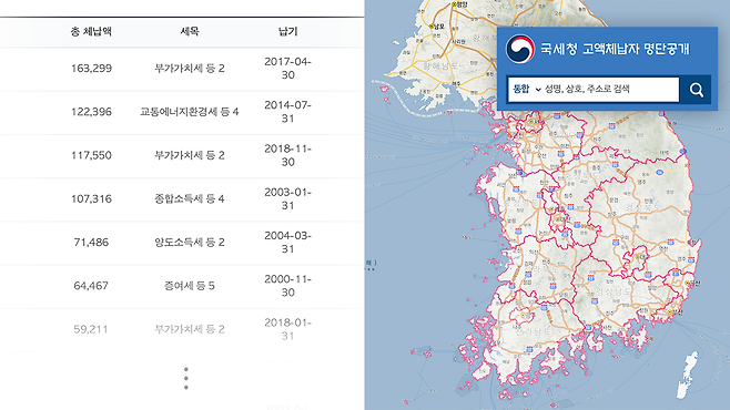 ※ 국세청 고액체납자 명단공개 지도