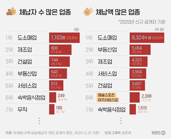 그런데 이를 체납액 순으로 다시 순위를 매겨보면 눈에 띄는 변화가 보입니다. 위에서 언급했던 '예술, 스포츠 및 여가관련 서비스업'이 갑자기 상위로 올라오는 겁니다. 2020년 신규 공개자 기준으로는 19명, 0.4%에 그쳐 11위였는데, 체납액 기준으로는 6위로 껑충 올라옵니다. 이 업종 체납액 합계는 2,398억원으로 전체의 7.2%에 해당합니다.