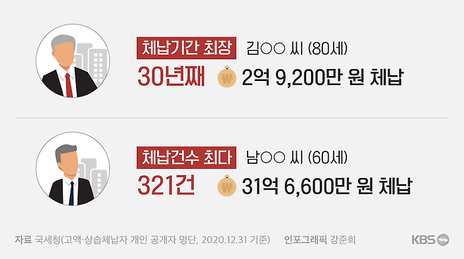 가장 오래 체납한 체납자, 가장 많은 건수를 체납한 체납자도 여전히 버티고 있습니다. 2019년 기준으로 체납기간이 가장 길었던 체납자는 한 쇼핑업체 출자자인 80살 김모 씨인데요. 2020년 기준으로도 최장 기록을 갱신하며 이른바 '버티기 끝판왕' 자리에서 내려오지 않고 있습니다. 1년 사이 '29년째 체납'에서 '30년째 체납'으로 체납기간만 늘렸는데, 체납액 약 3억 원은 그대로입니다.