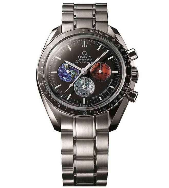 - 2003년 제작된 스피드마스터 '프롬 더 문 투 마스(From the Moon to Mars)' 에디션. 2020년까지 달에 유인 화성 탐사의 전진 기지가 될 영구적인 우주 정거장을 구축하겠다는 NASA의 발표를 기념하며 출시됨.